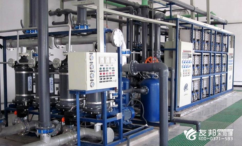 連續電除鹽是利用填充在淡水室中的混合離子交換樹脂吸附給水中的陰陽離子,同時這些被吸附的離子又在直流電壓的作用下發生橫向電遷移,并分別透過陰陽離子交換膜進入濃水室而被去除。另一方面,在給水前進的方向上,由于離子不斷被去除,溶液的電導率越來越低,在直流電壓的作用下水會發生解離以產生足夠的H+和OH-離子來維持系統的電流量,這些水解離產生的H+和OH-除了發生橫向電遷移外,還會就地把吸附有離子的樹脂再生,從而實現連續深度脫鹽。因此EDI過程的本質是離子交換、電滲析和水解離產生H+和OH-離子再生樹脂這三個過程的綜合過程。在此過程中,離子交換樹脂僅僅為離子提供一個導體的作用,因此不需要用酸和堿進行再生。電滲析才是EDI用來脫鹽的手段。但是樹脂終會因吸附飽和而發生離子泄露,無法使除鹽過程連續而穩定地運行。水解離是EDI的核心所在,而要實現水的解離。